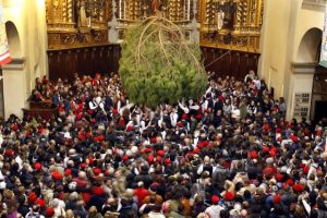 Acabada la ballada, el Pi és entrat a l’interior de l’església i se’l porta fins al presbiteri, on és lligat per la part inferior de tronc i penjat cap per avall sobre l’altar major amb cinc poms de pomes i neules lligats a la brancada. El Pi és hissat fins a l’alçada de Santa Coloma mentre els galejadors entonen l’Himne de Centelles.