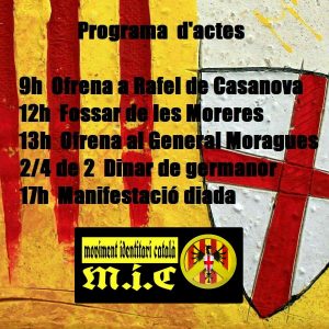 Aclariment: les dades són les reals i els actes els celebrarem el diumenge més proper a elles. « All Esdeveniments Aquest event ja ha passat. Diada de Catalunya 11/09/2017 @ 08:00 - 19:00 « Heribert Barrera tenia raó. Homenatge al General Moragues. » ComparteixemailFacebookGoogle+Twitter + Google Calendar+ Exportar iCal Detalls Data: 11/09/2017 Hora: 08:00 - 19:00 Organitzador Moviment Identitari Català Correu electrònic: Iolanda.mic@movimentidentitaricatala.com Web: www.movimentidentitaricatala.com Recinte Catalunya + Mapa de Google Web: movimentidentitaricatala.com