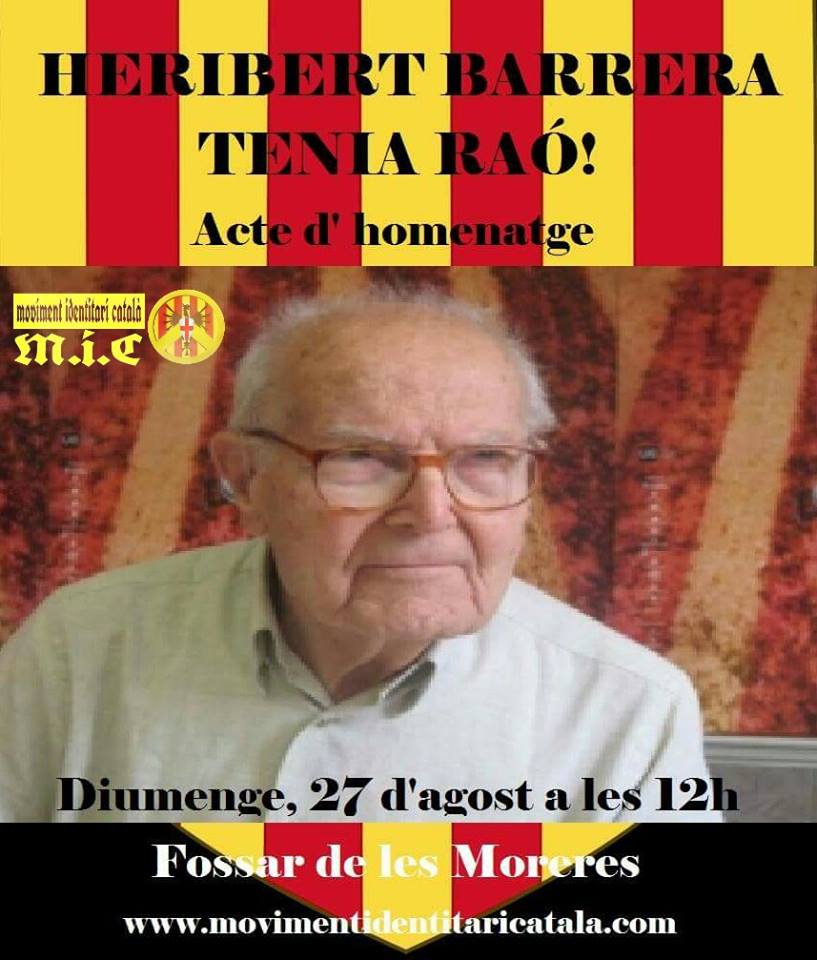 Aclariment: les dades són les reals i els actes els celebrarem el diumenge més proper a elles. « All Esdeveniments Aquest event ja ha passat. Heribert Barrera tenia raó. 27/08/2017 @ 12:00 - 14:00 « Aniversari M.I.C. Diada de Catalunya » ComparteixemailFacebookGoogle+Twitter + Google Calendar+ Exportar iCal Detalls Data: 27/08/2017 Hora: 12:00 - 14:00 Organitzador Moviment Identitari Català Correu electrònic: Iolanda.mic@movimentidentitaricatala.com Web: www.movimentidentitaricatala.com Recinte plaça del Fossar de les Moreres plaça del Fossar de les Moreres barcelona, Barcelona 08003 + Mapa de Google