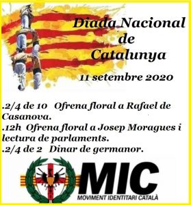 Programa d'actes: 2/4 de 10 Ofrena floral a Rafael de Casanova 12h Ofrena floral a Josep Moragues i lectura de parlaments 2/4 de 2 Dinar de germanor Hem de comunicar que per causes alienes a l'associació la programació dels actes podrà ser modificada per l'afectació general del coronavirus SARS-Cov-2. Demanem a tothom que vingui a gaudir de la Diada que sigui solidari amb la resta de persones i respecti les mesures de sanitat que ens recomana seguir…