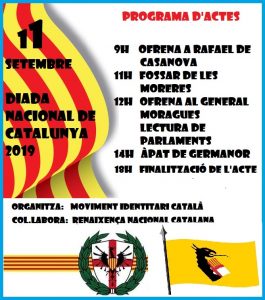 Comencen el jorn amb una ofrena floral a Rafael de Casanova, ens arribarem al Fossar de les Moreres i finalitzarem davant del monument al General Moragues on llegirem els parlaments. Agafarem forces gaudint d'un àpat de germanor i clourem la jornada.